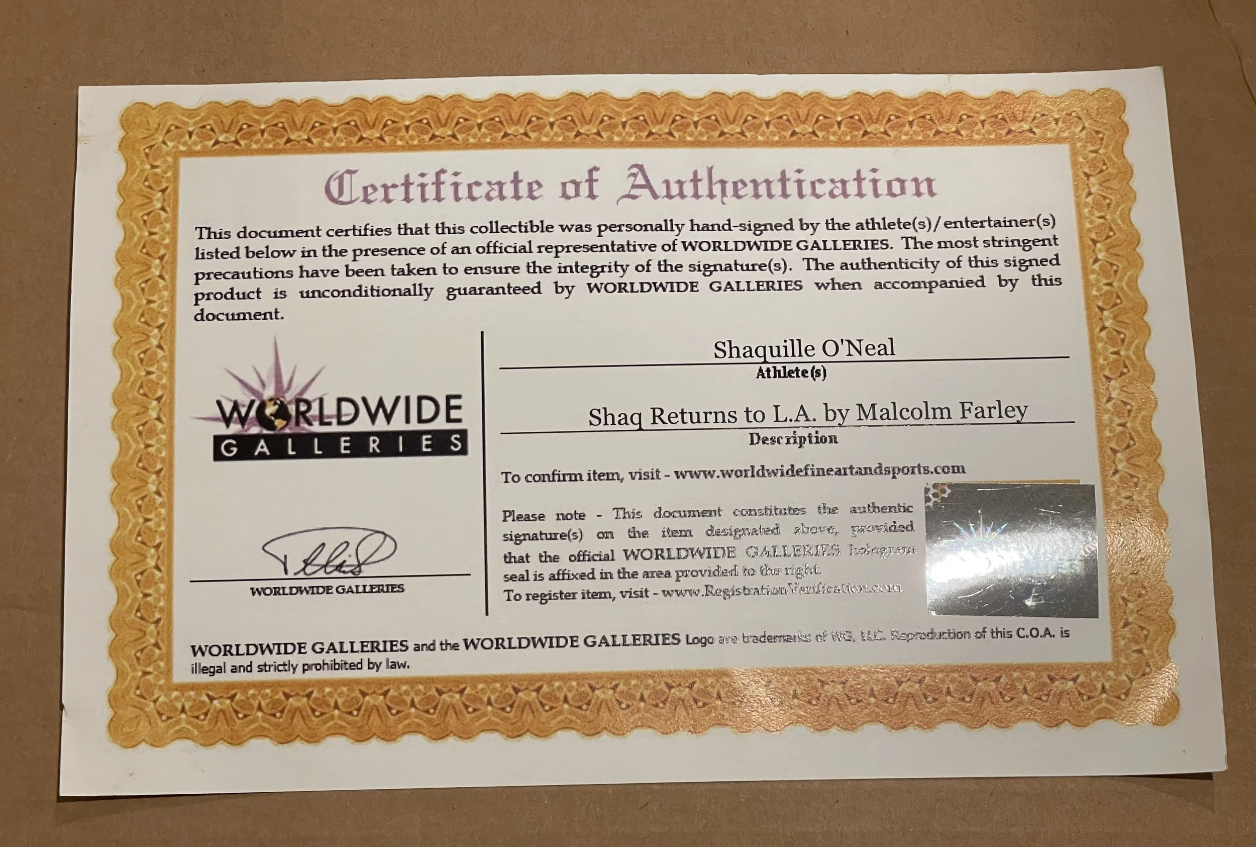 STORE Shaquille O' Neal - Return to LA Signed Malcolm Farley Painting $1,000.00 Mickey Mantle - Triple Crown Signed Malcolm Farley Painting JSA Authenticated $1,500.00 Holmes vs. Shavers Painting by Leroy Neiman All Signed JSA Authenticated $3,000.00 Tommy Hearns Fight Poster Signed $720.00 Jake LaMotta "Raging Bull" Movie Poster Signed $300.00 Joe Frazier Canvas Print Signed $350.00 Joe Frazier Signed Glove $450.00 Larry Holmes Signed Glove $250.00 Alex Rodriguez Painting Signed by Him and Carlo Beninati 1 of 3 JSA Authenticated $1,000.00 Alex Rodriguez Painting Signed by Him and Carlo Beninati 2 of 3 $650.00 Alex Rodriguez Painting Signed by Him and Carlo Beninati 3 of 3 $750.00 Joe Montana Painting Signed by Him and Carlo Beninati 1 of 3 $475.00 Joe Montana Painting Signed by Him and Carlo Beninati 2 of 3 $450.00 Joe Montana Painting Signed by Him and Carlo Beninati 3 of 3 $500.00 Arnold Palmer Canvas Print Signed by Arnold and Doug Louden JSA Authenticated $1,350.00 Peyton Manning Signed Photo 1 of 2 $350.00 Peyton Manning Signed Photo 2 of 2 $250.00 Pete Rose Signed Helmet 1 of 2 $150.00 Pete Rose Signed Helmet 2 of 2 $150.00 Duke Snider Signed Helmet $180.00 Disney Animation Cel 1 of 8 $120.00 Disney Animation Cel 2 of 8 $120.00 Disney Animation Cel 3 of 8 $120.00 Disney Animation Cel 4 of 8 $120.00 Disney Animation Cel 5 of 8 $120.00 Disney Animation Cel 6 of 8 $120.00 Disney Animation Cel 7 of 8 $120.00 Disney Animation Cel 8 of 8 + Duplicate $120.00 Warner Bros Serigraph $140.00